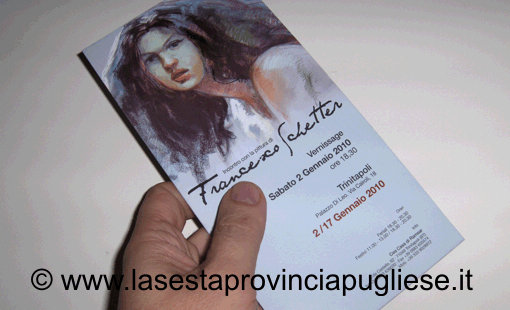 TRINITAPOLI..:: Si inaugura il 2 gennaio 2010 alle ore 18:30 nella cittadina pugliese, una mostra personale di pittura e grafica dell'artista Francesco Schetter. La mostra è allestita presso il Palazzo Di Leo, in via Cairoli, 18 nel centro cittadino e resterà aperta dal 2 al 17 gennaio 2010. Gli orari feriali sono dalle ore 18:30 alle ore 20:30, mentre quelli festivi saranno dalle ore 11:00 alle ore 13:00 e dalle ore 18:30 alle re 20:30. Nato nel 1955 a Napoli, Francesco Schetter è stato protagonista sin da giovanissimo. La sua prima mostra collettiva risale al 1969 a Napoli a cui seguirono moltissime altre. Nel 1972 risale la sua prima esposizione "personale" a Portici. Si trasferisce a Trinitapoli nel 1986 e l'anno successivo riceve il premio De Nittis a Barletta. Numerose sono le sue opere fuori dal territorio italiano. Insomma, è una mostra per chi ama la buona pittura e la grafica pittorica.