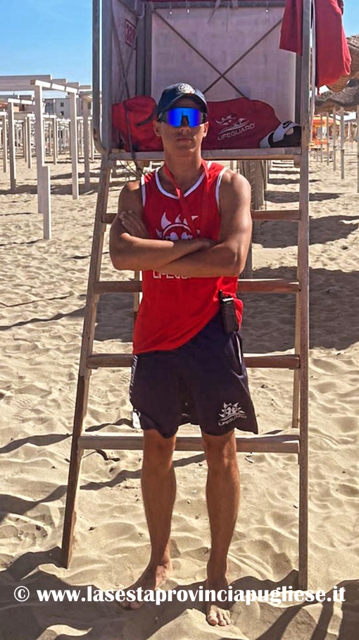 MARGHERITA DI SAVOIA: Il giovane bagnino Sergio Del Buono, in servizio presso la Lifeguard, protagonista dell'intervento in mare di oggi 1 luglio 2025.