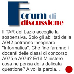 | Docenti di Informatica: Il TAR del Lazio accoglie la sospensiva. Solo gli abilitati di A042 potranno insegnare Informatica. Fatti e misfatti della nuova Scuola italiana: è guerra tra docenti. |